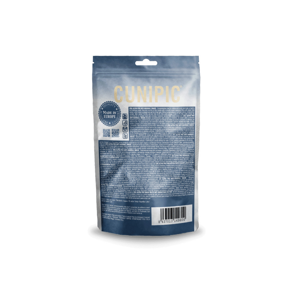 A Cunipic Alpha Pro Malátás Snack egy különleges jutalomfalat, amely kifejezetten nyulak és rágcsálók számára készült. Ez a ropogós falatka segít a szőrlabdák kialakulásának megelőzésében a benne lévő malátakivonat révén, miközben omega-3 és omega-6 zsírsavakkal, valamint vitaminokkal támogatja kedvencünk bőrét és szőrzetét. A malátás ízvilág igazán vonzóvá teszi a kisállatok számára.