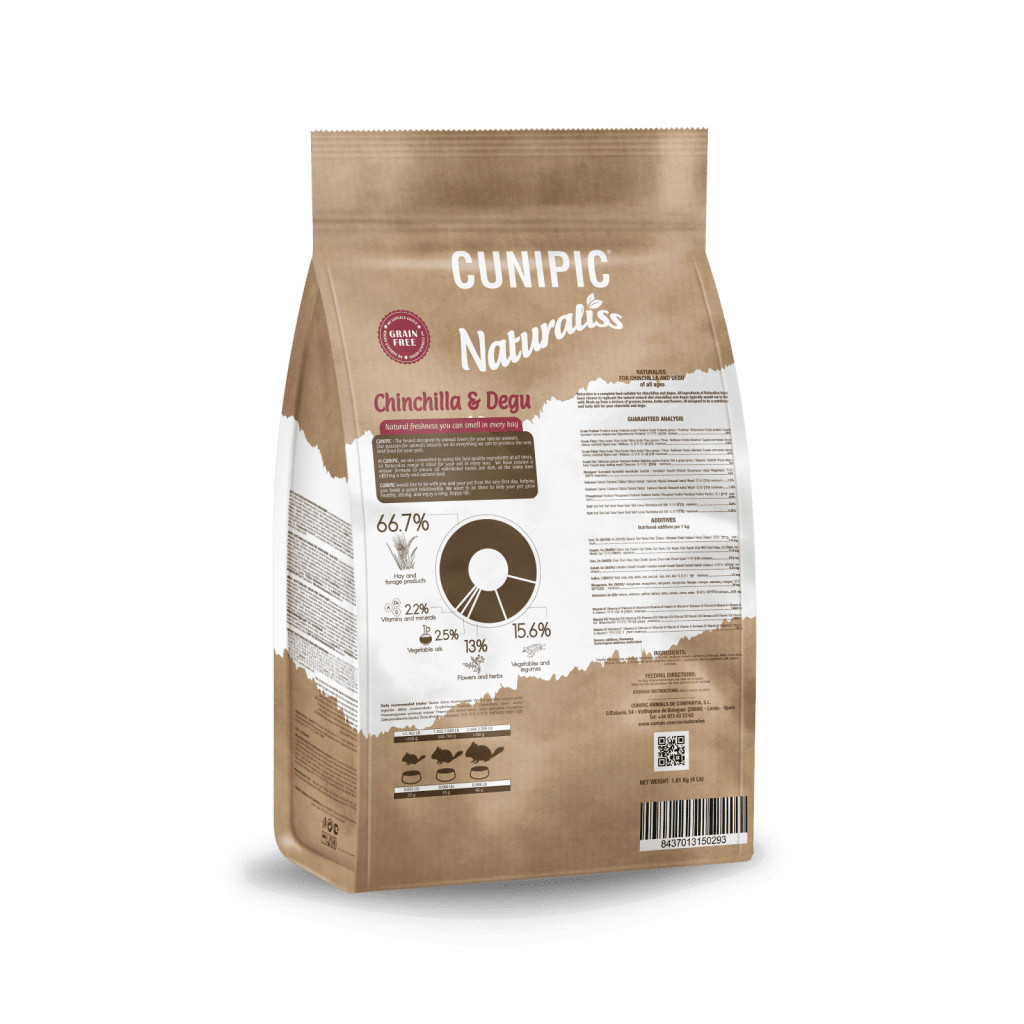 A Naturaliss Csincsilla és Degu Eledel gondosan válogatott természetes összetevőkből készült, hogy a csincsillák és deguk számára biztosítsa a szükséges tápanyagokat. Magas rosttartalma elősegíti az egészséges emésztést és a fogak megfelelő kopását, miközben omega-3 és omega-6 zsírsavakat, vitaminokat és ásványi anyagokat tartalmaz, amelyek hozzájárulnak kedvenceid hosszú távú egészségéhez és jó közérzetéhez. A Naturaliss 60% -ban hidegen sajtolt takarmányból áll. Ez a módszer kedvez az állat szervezetének, és optimalizálja a táplálék asszimilációját, mivel sokkal jobban megőrzi fehérjéit, vitaminjait és ásványi anyagait. 30% szénához, a Pireneusok hegységéből származó vad széna, amelyben szinte nincs emberi beavatkozás. Ez peszticid- és mesterséges színezék- vagy tartósítószer-mentes élelmiszert kínál, így a kis rágcsálóknak a legjobb szénát kínálja a megfelelő fogviseléshez. A 10% virág és a a különféle vadon élő növények kiváló ízt, frissességet és aromát kínálnak a terméknek. Ez a választék tökéletesen igazodik minden rágcsáló szükségleteihez, ügyelve mindennapi egészségükre, és a lehető legközelebb kerül a természetben fogyasztott táplálékhoz.