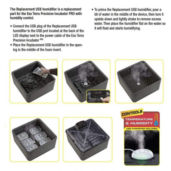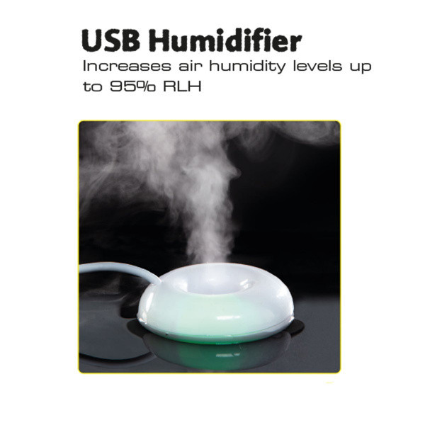 - A higrosztát USB párásítón keresztül szabályozza a páratartalmat, amely optimális szinten tartja a páratartalmat