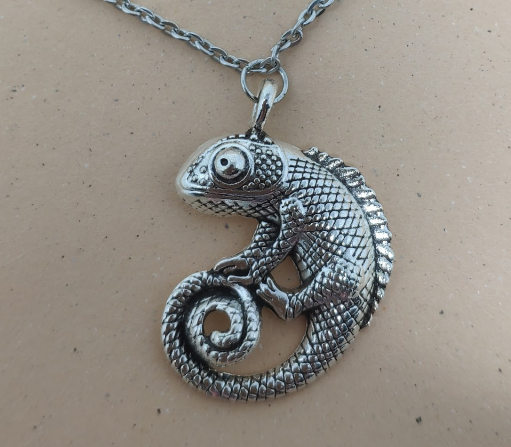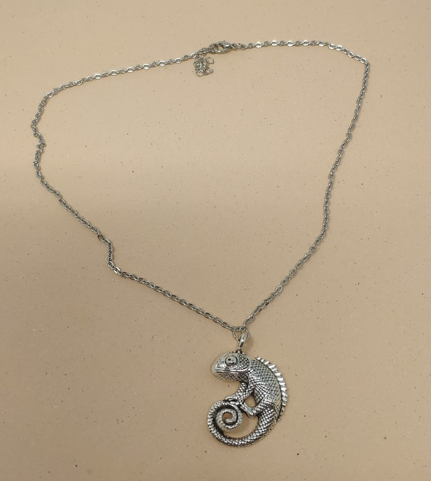 Ez az egyedi stílusú, ezüstszínű nyaklánc dombornyomott kaméleon medállal igazi különlegesség a természet szerelmeseinek. A medál részletgazdag kialakításának köszönhetően látványosan megjeleníti a kaméleon textúráját, pikkelyeit és tekergőző farkát. A kis szemű, mégis strapabíró lánc tökéletesen kiegészíti a hangsúlyos medált, így a nyaklánc ideális mindennapi viselethez vagy akár ajándékként is.