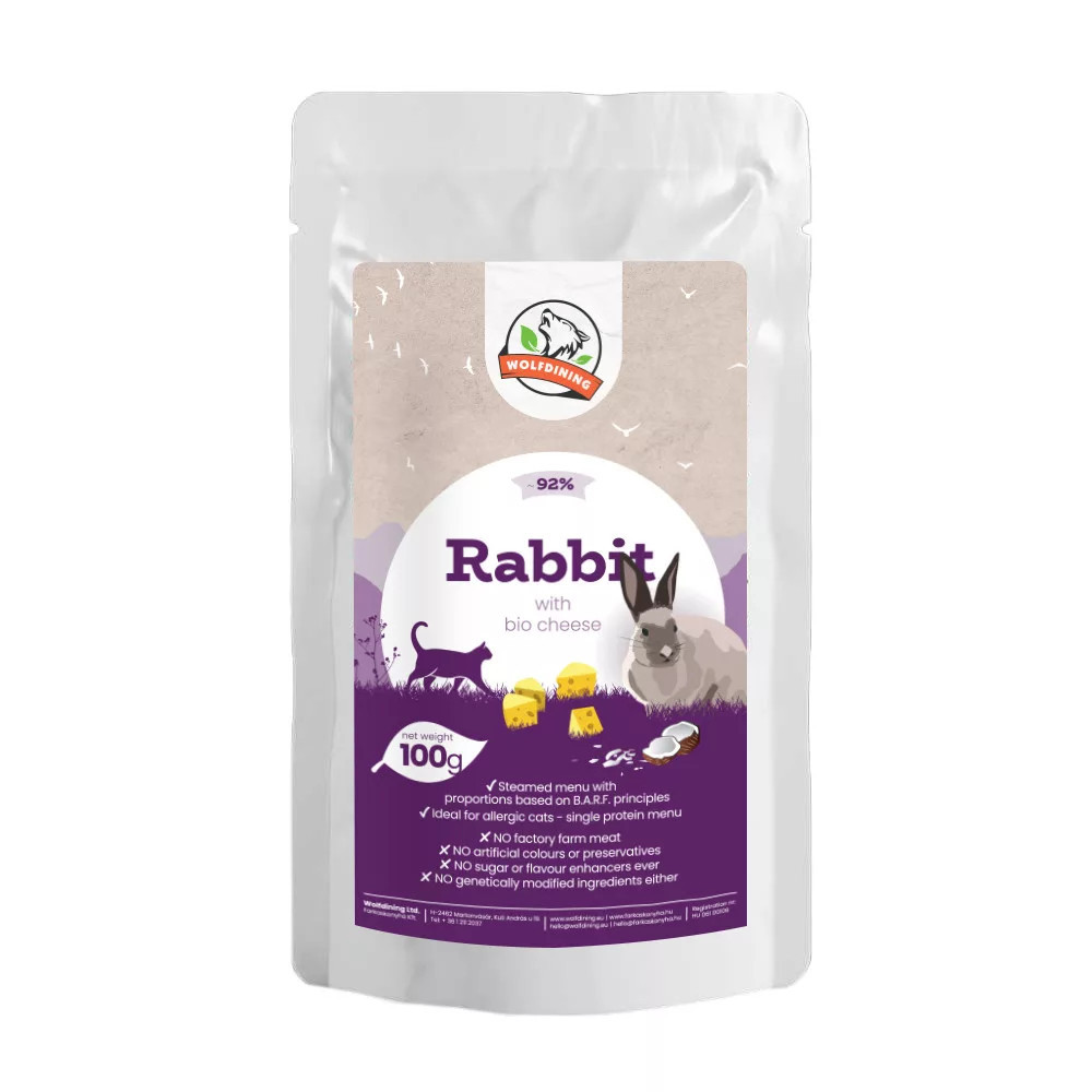 A Farkaskonyha Nyúl párolt menü macskáknak 100 g receptúrája BARF alapelvek alapján készült, etikus gazdálkodásból származó nyúlhúsból és minőségi bio összetevőkből. A menü 92,35 % nyúlhúst tartalmaz (izomhús, szív, tüdő, máj természetes arányban), amelyhez 4 % bio sajt, 1,5 % bio kókuszpehely és 0,5 % bio kókuszolaj járul, emellett tartalmaz kis mennyiségű vörös és barna algát (Lithothamnium calcareum, Ascophyllum nodosum).