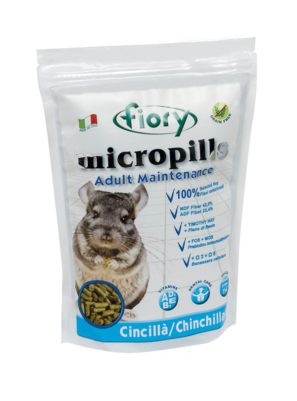 A Fiory Micropills Adult Maintenance célzottan felnőtt csincsillák számára készült, hogy támogassa egészségüket és vitalitásukat. A vitaminokban és ásványi anyagokban gazdag formula erősíti az immunrendszert, fenntartja a csontok és szőrzet egészségét, valamint biztosítja a szükséges tápanyagokat az optimális anyagcsere és jóllét érdekében.