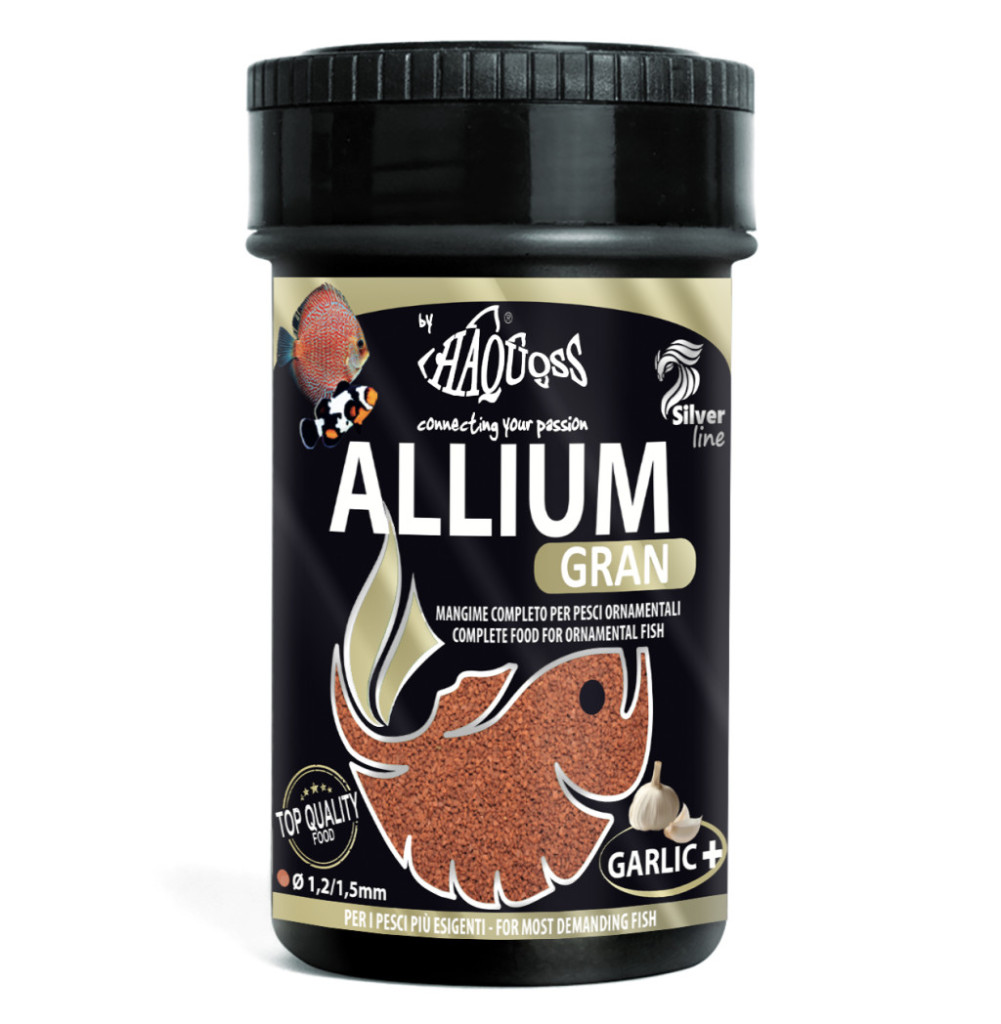 A Haquoss ALLIUM GRAN egy teljes értékű, prémium minőségű granulált haltáp, amely kifejezetten akváriumi díszhalak – különösen diszkoszhalak – táplálkozási igényeinek kielégítésére lett kifejlesztve. Természetes fokhagyma-tartalmának köszönhetően támogatja a halak immunrendszerének megfelelő működését, valamint segíti az emésztést, ezáltal hozzájárul az általános egészségi állapotuk javításához.