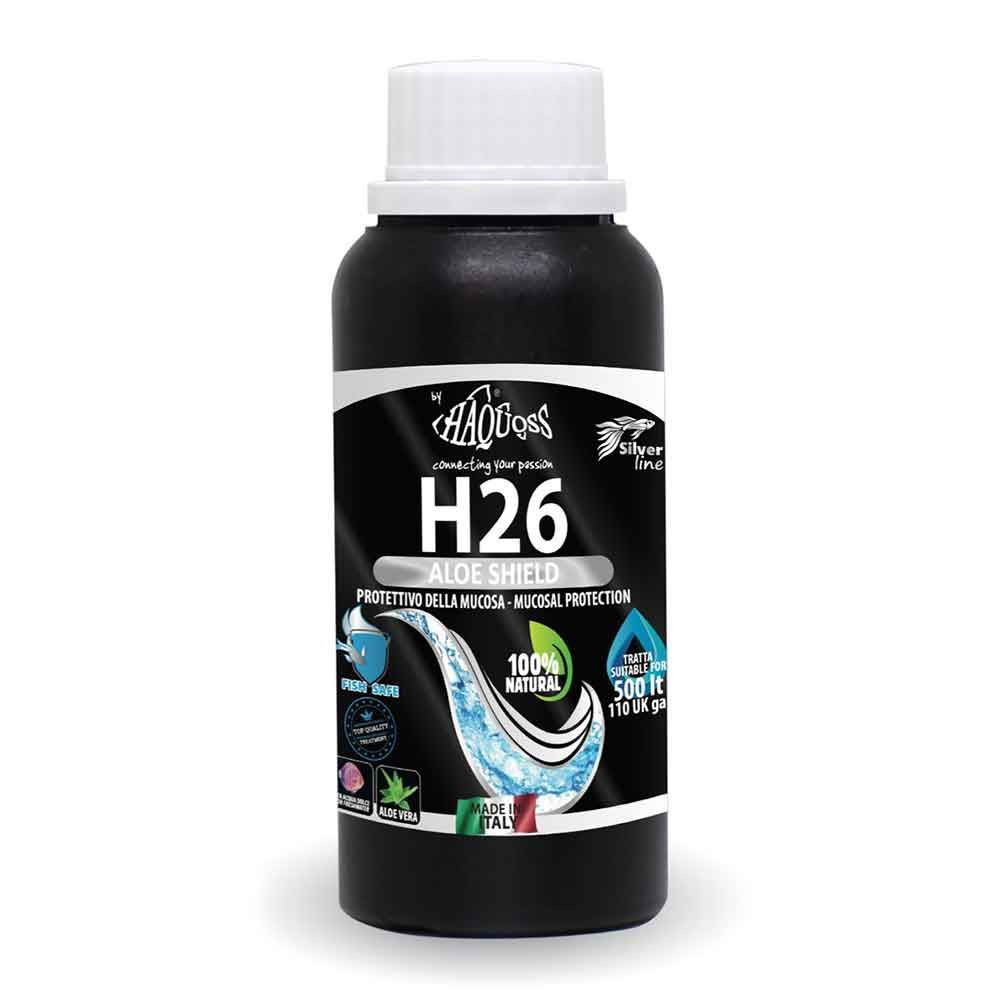 A Haquoss H26 Aloe Shield egy speciálisan édesvízi akváriumokhoz fejlesztett természetes alapú vízkezelő készítmény, melynek fő hatóanyaga az aloe vera kivonat. Ez a folyékony készítmény támogatja a halak nyálkahártyájának egészségét, elősegíti a kisebb sérülések gyorsabb gyógyulását, valamint javítja az akvárium vízminőségét, ezzel hozzájárulva a stresszcsökkentéshez és a halak optimális közérzetéhez.