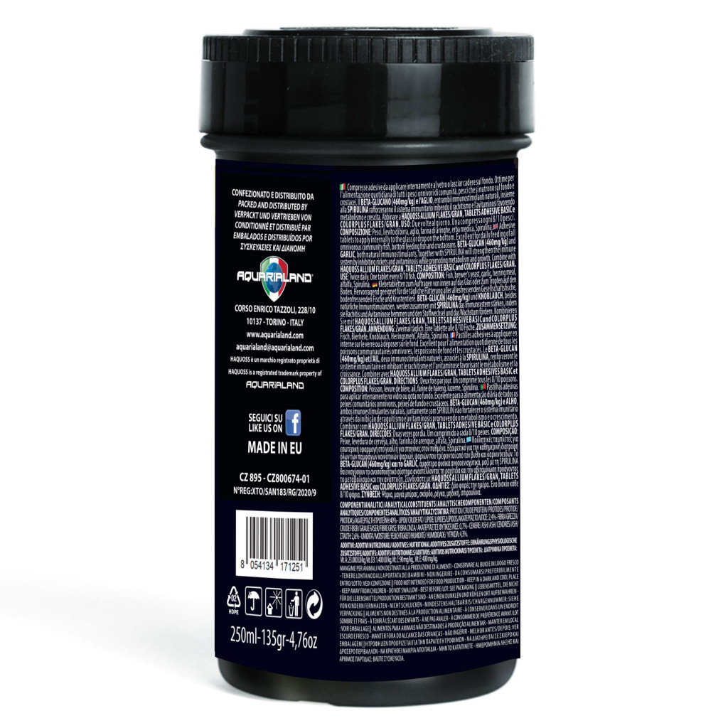 Széleskörű felhasználhatóság: A Haquoss TABLETS ADHESIVE VEGGIE mindenféle növényevő és mindenevő akváriumi halfaj, valamint gerinctelen számára ideális táplálék. Kiváló választás vegyes akváriumokban, ahol különböző táplálkozási igényű fajok élnek együtt, és ahol fontos a változatos, növényi alapú étrend biztosítása.