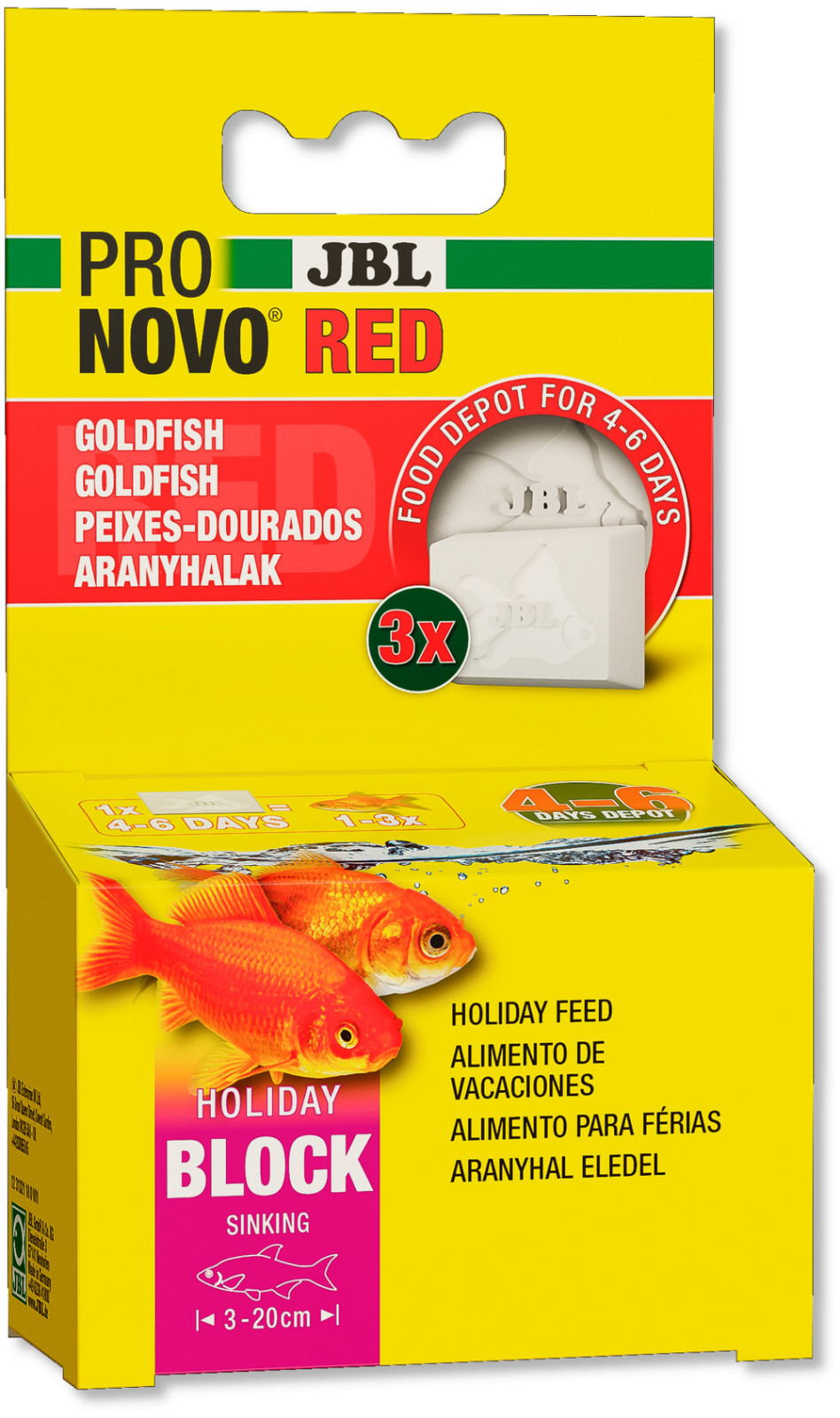 A legtöbb akváriumi hal, kivéve a fiatalokat, akár egy-két napig is táplálék nélkül marad – akárcsak a vadonban. Ekkor azonban sok akváriumtulajdonosnak lelkiismeretfurdalása támad, és ezért a JBL PRONOVO HOLIDAY RED rövid távollétre is elérhető.