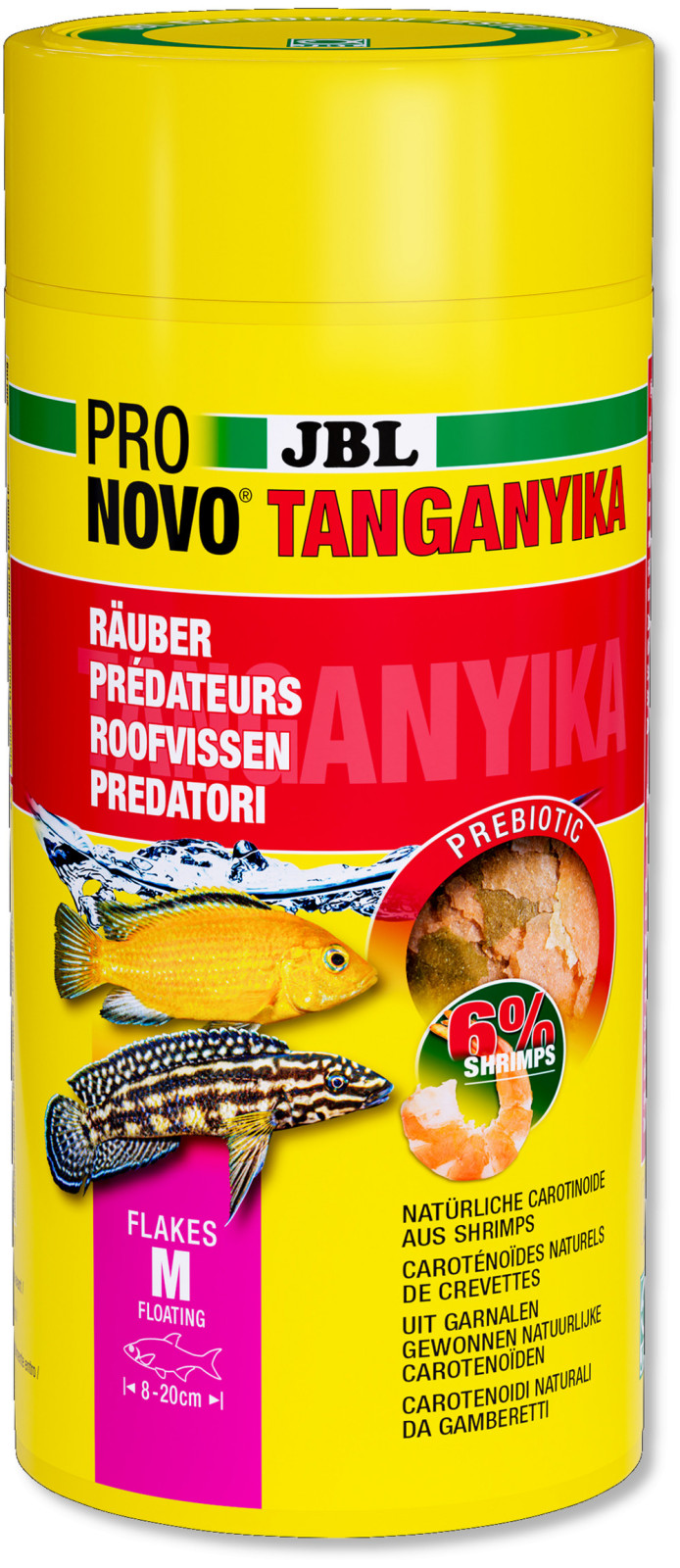 Ezzel szemben mindkét tóban szinte minden megmaradt faj ragadozó életet él, és halat, mikroorganizmust, garnélarákot és halivadékot eszik. Vannak, akik más halak (Plecodus) pikkelyeit is megeszik. A JBL JBL PRONOVO TANGANYIKA ragadozó fajok számára lett kifejlesztve. Ha mindkét csoportot EGY akváriumban tartjuk, elengedhetetlen, hogy mindkét típusú ételt kínáljuk. Ezután minden etetési típus a megfelelő táplálékot kapja.