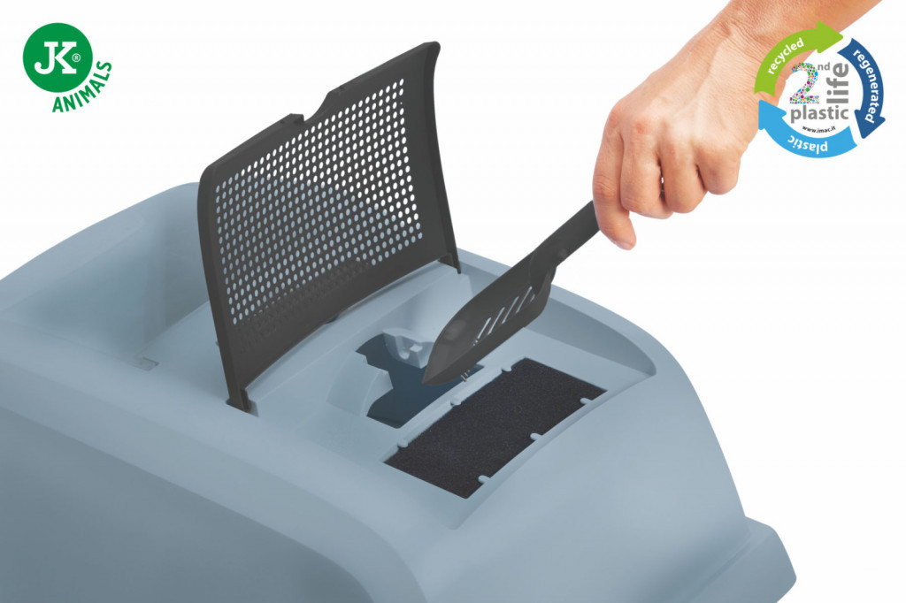 A toalett újrahasznosított műanyagból készül, ami környezetbarát megoldás a tudatos gazdik számára. A zárt kialakítás és a lengőajtó csökkenti az alom szétszóródását, miközben bent tartja a kellemetlen szagokat. A tetején elhelyezett aktívszén szűrő hatékonyan semlegesíti a szagokat, frissen tartva a környezetet, míg a mellékelt alomlapát megkönnyíti a napi tisztán tartást és az alom cseréjét.