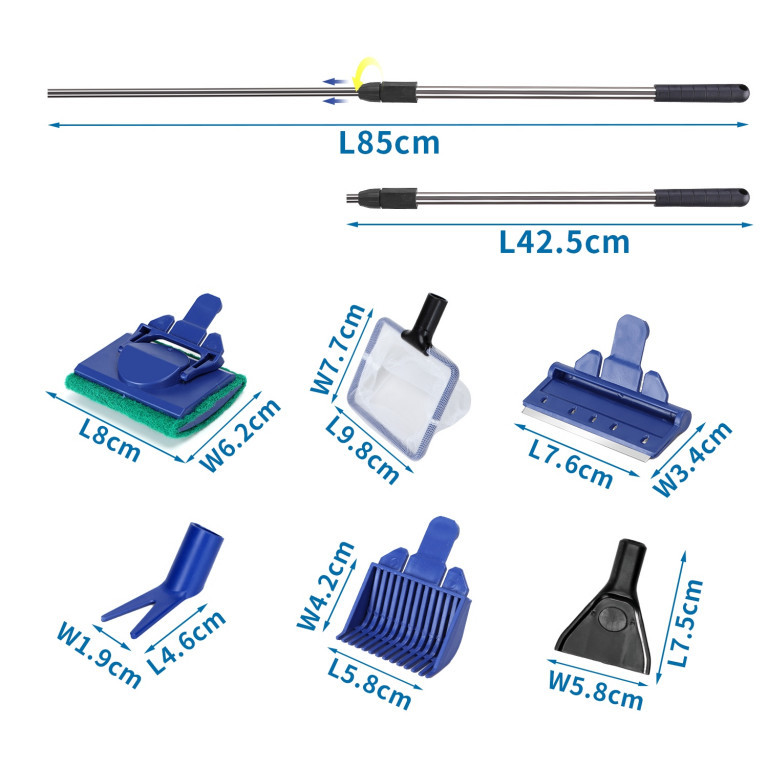 A teleszkópos nyél 42,7 cm-től egészen 80 cm-ig kihúzható, így mélyebb akváriumokhoz is kiválóan alkalmas. A fejek között található egy éles algakaparó a makacs szennyeződésekhez, egy puha szivacs az üveg kíméletes tisztításához, egy növénycsipesz a rendezéshez, egy kavicsgereblye az aljzat karbantartásához, valamint egy finom szemű halháló. A minőségi ABS műanyag szerkezet garantálja a hosszú élettartamot és a korróziómentes használatot édes- és tengervízben egyaránt.