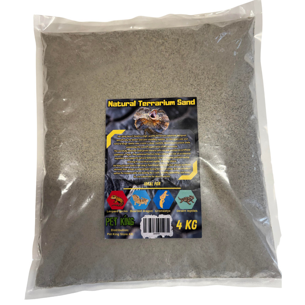 A Pet King sivatagi homok egy gondosan válogatott, természetes aljzat, amelyet kifejezetten sivatagi terráriumok kialakításához fejlesztettek ki. A bézses-fehér színárnyalat nemcsak esztétikus, tiszta megjelenést kölcsönöz a terráriumnak, hanem kiválóan visszaadja a természetes élőhelyek hangulatát, legyen szó szakállas agámáról, leopárd gekkóról vagy tüskésfarkú gyíkról.