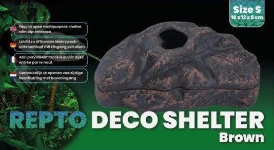 A Repto Deco Shelter Brown S nemcsak hüllők, hanem kétéltűek, kisebb emlősök és rovarok számára is tökéletes búvóhely. Tökéletes választás például gekkóknak, kígyóknak, agámáknak, békáknak és más terráriumi lakóknak, akik szeretnek elrejtőzni vagy egy csendes, nyugodt helyen pihenni. Kompakt méretének köszönhetően szinte bármilyen méretű terráriumban elhelyezhető, miközben biztosítja kedvenced számára a kényelmet és biztonságot.