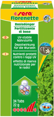 A Sera Florenette tabletták minden szükséges tápanyagot tartalmaznak, amelyre az akváriumi növényeknek szükségük van. Ezek az összetevők elősegítik a növények erőteljes növekedését, zöldellését és virágzását.