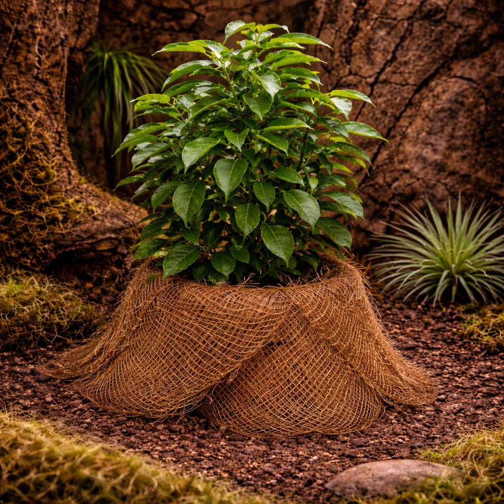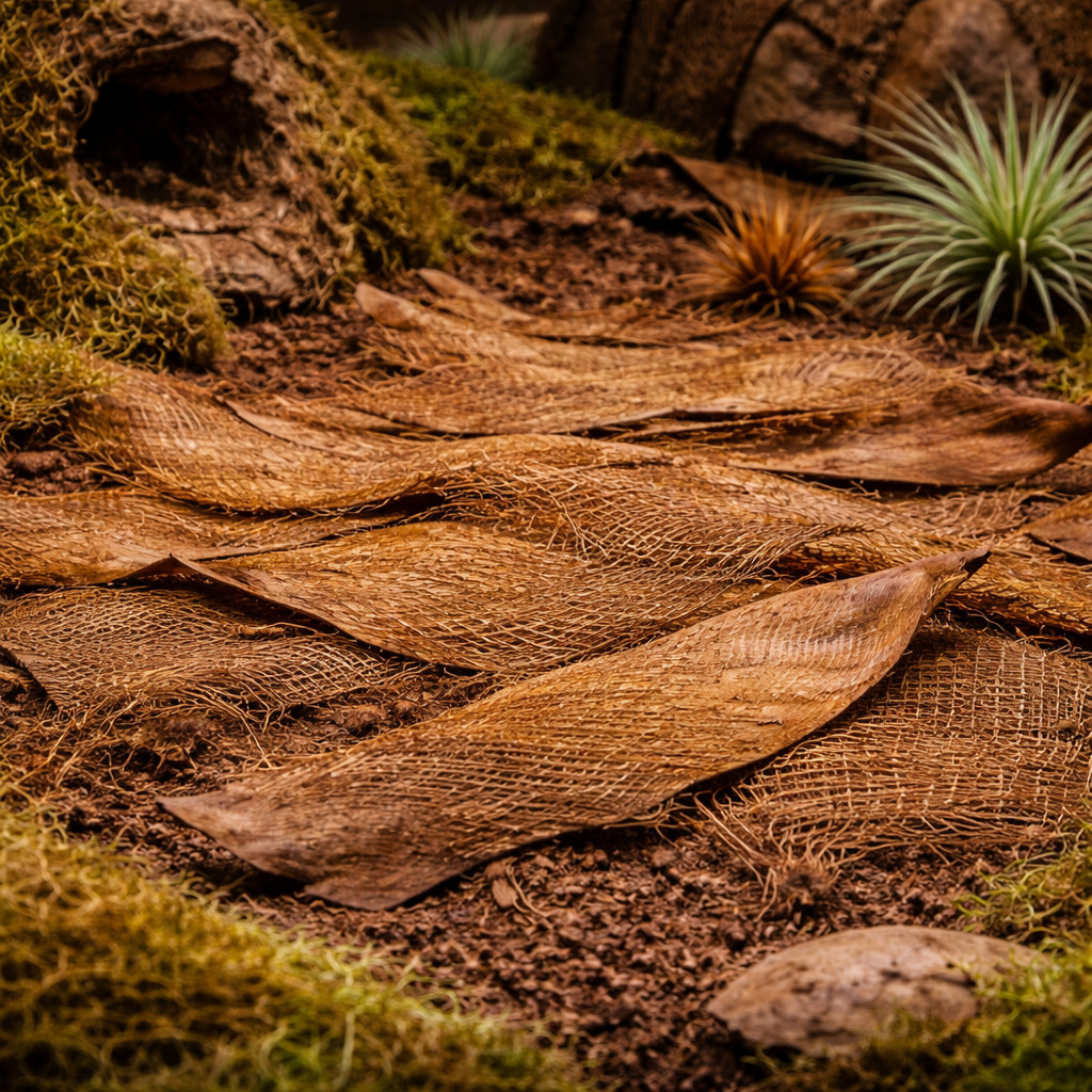 A természetes pálmarost az egyik legsokoldalúbb bio-dekorációs alapanyag a terrarisztikában és a növénygondozásban. Ez a rostos, hálószerű anyag rendkívül rugalmas, így szinte bármilyen felületre rátekerhető, ráköthető vagy ragasztható. Kiválóan alkalmas a szemnek kevésbé tetsző részletek – például műanyag virágcserepek, kábelek vagy technikai berendezések – esztétikus elrejtésére, miközben teljesen természetes hatást kelt.