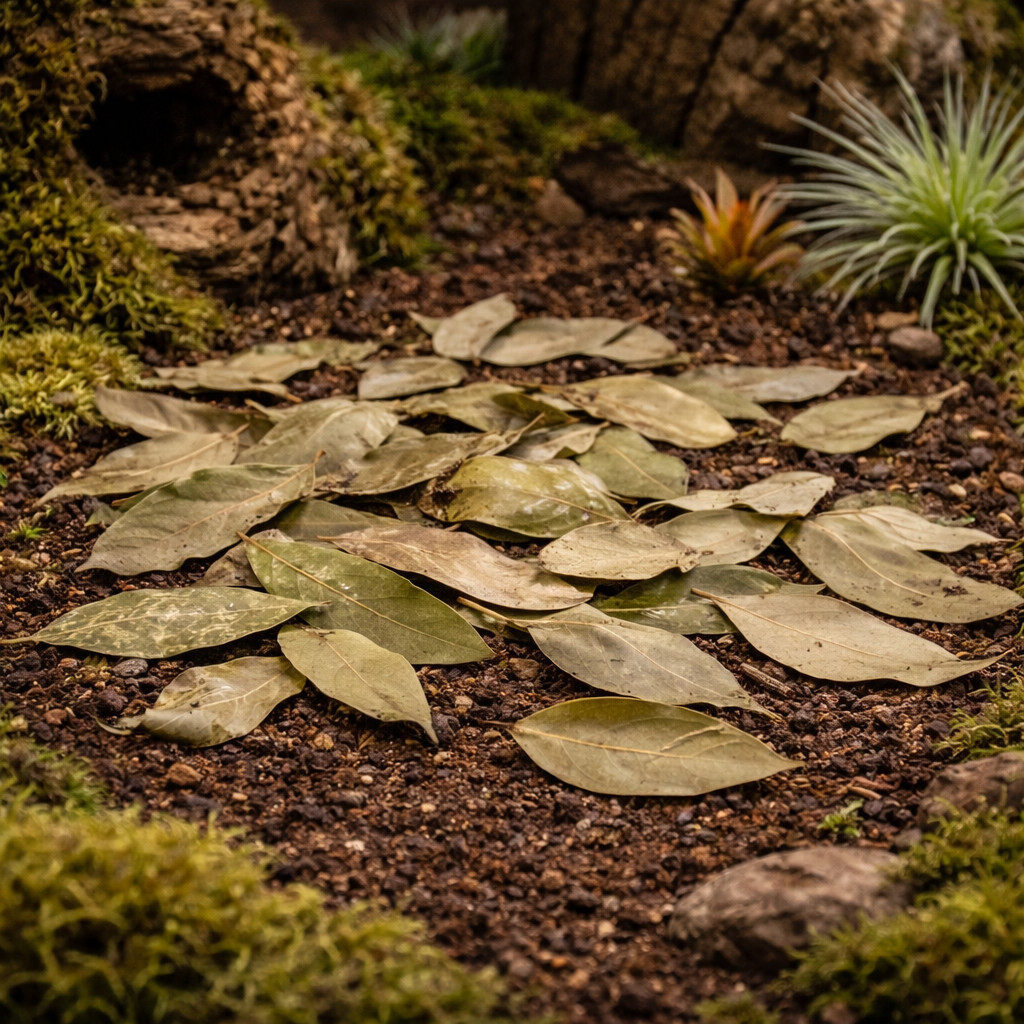 A hüllők és kétéltűek számára a levelek alatti rétegek biztonságos búvóhelyet és mikro-párásító zónákat teremtenek, ami segíti a stresszmentes vedlést és pihenést. A babérlevél természetes illóolaj-tartalma száraz állapotban minimális, így az állatokra teljesen veszélytelen, ugyanakkor enyhe antibakteriális hatással bírhat a talajfelszínen. 1,5 literes kiszerelése bőségesen elegendő egy közepes méretű terrárium avarrétegének frissítéséhez vagy kialakításához.