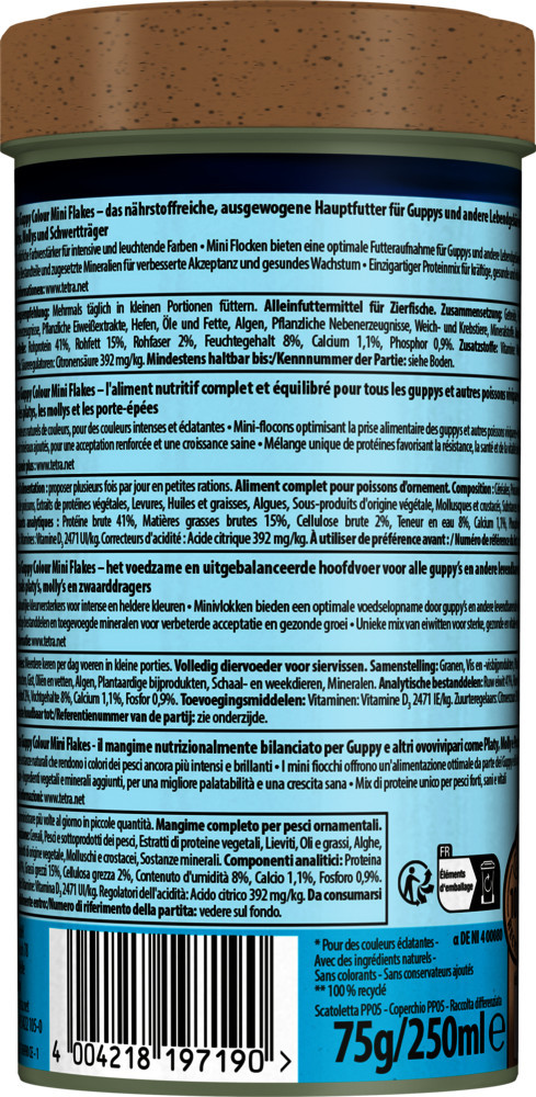 A Tetra Guppy Colour Mini Flakes a népszerű guppi táp továbbfejlesztett, extra színfokozókkal ellátott változata. A receptúra magas koncentrációban tartalmaz természetes színanyagokat (karotinoidokat), amelyek már néhány hét rendszeres etetés után láthatóan mélyítik a halak vörös, sárga és narancssárga színeit, miközben ragyogó fényt kölcsönöznek a pikkelyeknek.