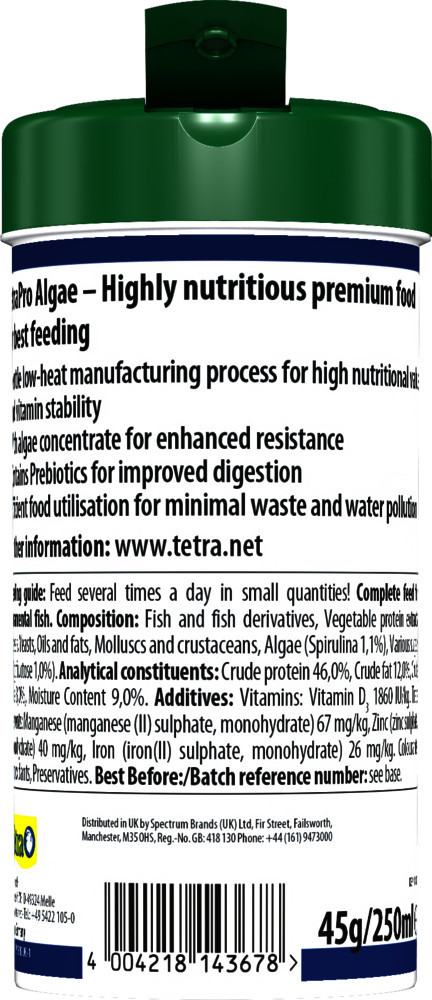 Ha növényevő halai (pl. mollik) előszeretettel csipkedik az akváriumi élő növényeket, a TetraPRO Algae rendszeres etetésével csökkentheti ezt a viselkedést, mivel a táp biztosítja számukra a szükséges minőségi növényi fehérjéket.