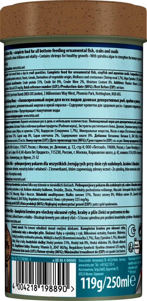 A Tetra Wafer Mix egy speciálisan összeállított keverék, amely barna és zöld korongokat tartalmaz. A barna ostyák magas állati fehérjetartalmukkal elsősorban a mindenevő aljzaton lakó halak, például a páncélosharcsák igényeit elégítik ki. A zöld ostyák értékes Spirulina algát tartalmaznak, amely ideális a növényevő halak és rákok számára.