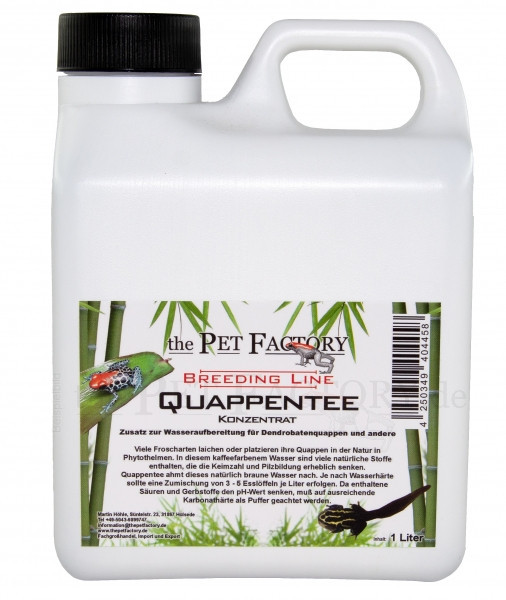 A The Pet Factory Quappentee (ebihal-tea) egy évtizedek óta bevált módszer a kétéltűtenyésztők körében, most praktikus koncentrátum formájában. Ez a készítmény értékes csersavakat, huminsavakat és flavonoidokat tartalmaz, amelyek természetes módon enyhén savasítják a vizet, hasonlóan a trópusi esőerdők természetes vizeihez. Ezek az összetevők gombaölő és antibakteriális hatással bírnak, ami kritikus a rendkívül érzékeny ebihalak túlélése szempontjából.
