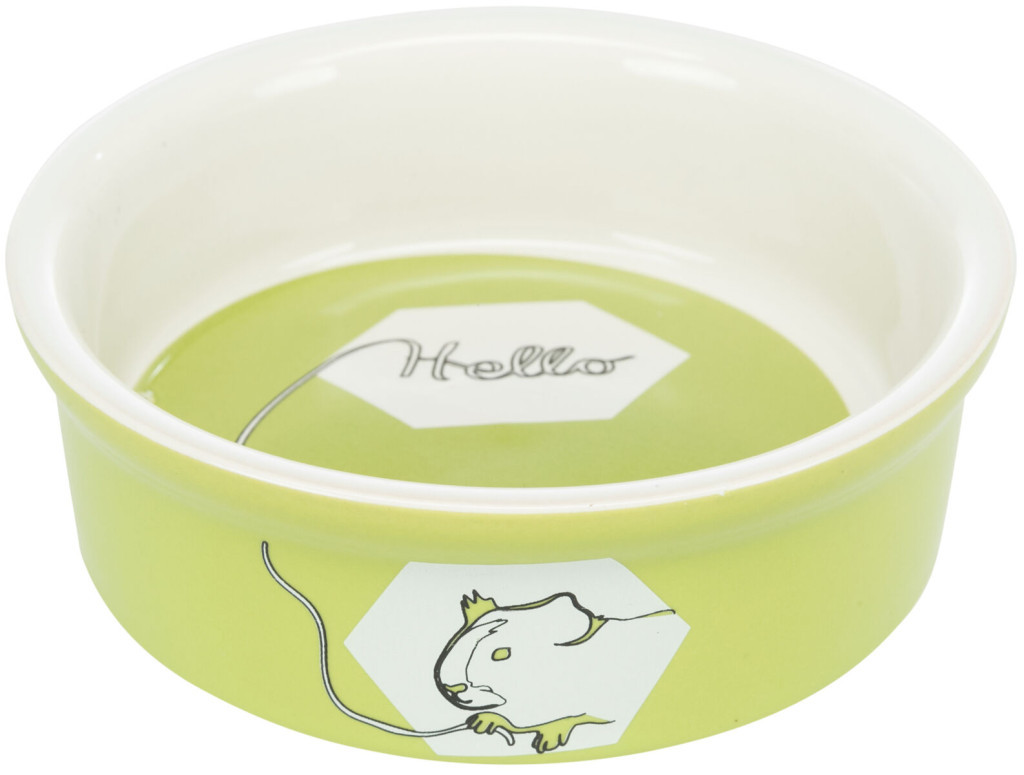 A tálka mázas kerámiából készül, ami nemcsak esztétikus, de rendkívül tartós is. A műanyag tálakkal ellentétben teljesen rágásbiztos, nem karcolódik, és nem veszi át az élelmiszerek szagát. A tál oldalát kedves tengerimalacos motívumok és feliratok díszítik, több modern színben is elérhető, így bármilyen ketrecberendezéshez illeszkedik. A 11 cm-es átmérő kényelmes hozzáférést biztosít az állatnak, a 240 ml-es űrtartalom pedig ideális a napi zöldség- vagy pelletadag tálalásához.
