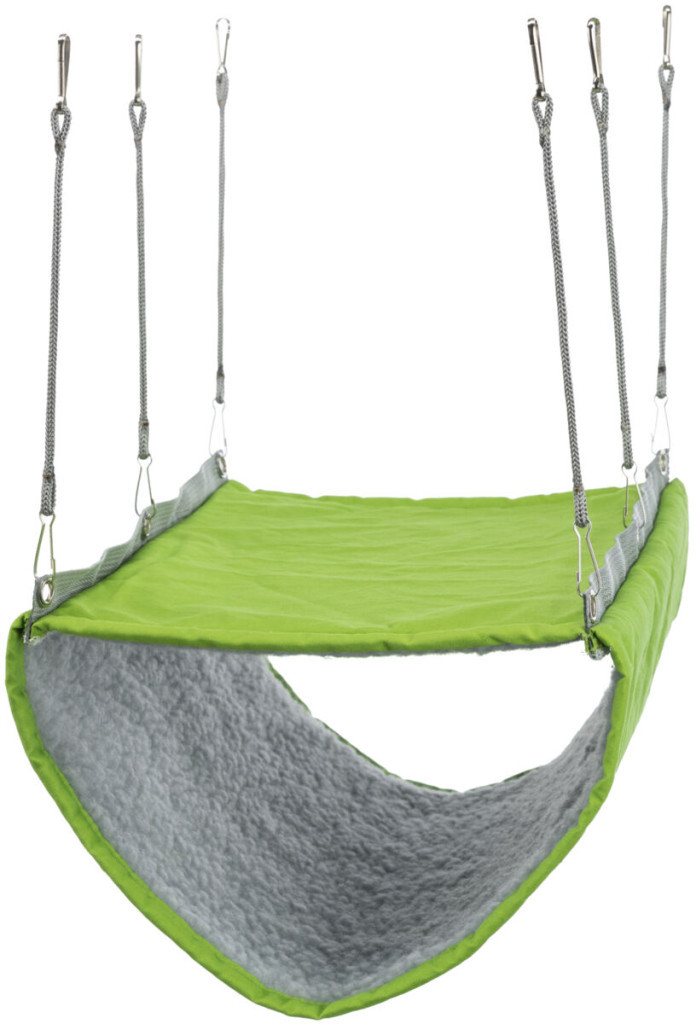 Akassza fel a függőágyat a ketrec tetejére úgy, hogy az állatok kényelmesen elérhessék (például egy közeli polcról vagy létráról). Ügyeljen rá, hogy a rögzítés stabil legyen. Rendszeresen ellenőrizze az anyag épségét; ha a rágcsálók elkezdenék szétrágni és a bélés vagy a szálak szabaddá válnak, a biztonság érdekében cserélje ki a terméket.