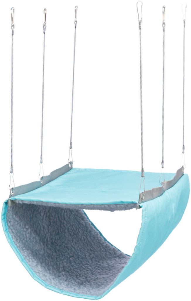 A függőágy tartós, de puha anyagból készült, belseje pedig báránybőr-utánzatú (műszőrme) bélést kapott, amely kiváló hőszigetelő. A négy sarkán található stabil fém láncok és akasztók segítségével könnyen és biztonságosan rögzíthető bármilyen rácsos ketrec tetejére. A két emelet közötti nyílás lehetővé teszi az állatok számára a szintek közötti gyors közlekedést, így a függőágy nemcsak pihenőhely, hanem a játék és az interakció színtere is.