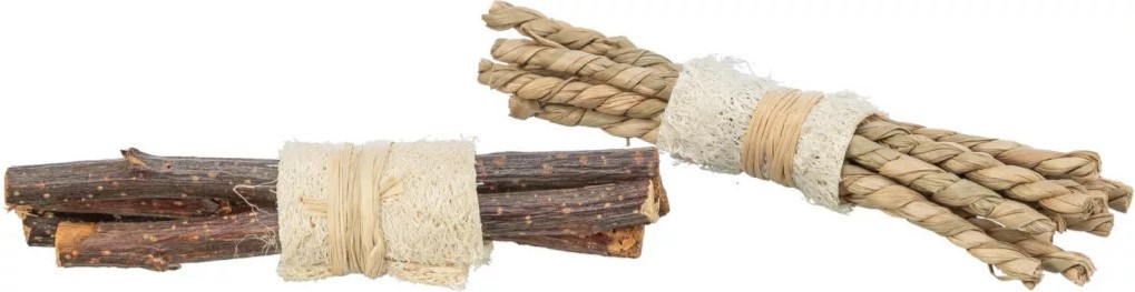 A Trixie játék botocskák tengeri fűvel természetes és szórakoztató kiegészítők nyulak számára, amelyek egészséges szórakozást és fogkoptatást biztosítanak. A két darab, 10x3 cm méretű botocska tengeri fűből készült, így nemcsak ellenálló, hanem teljesen biztonságos is kedvenced számára. A rágcsálás segíti a fogak természetes kopását, miközben kielégíti a nyulak ösztönös rágási igényét, és megelőzi az unalmat.