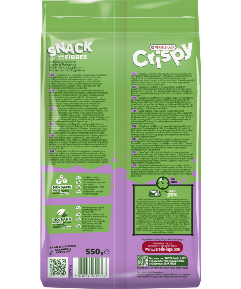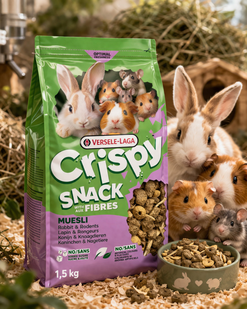 A Versele-Laga Crispy Snack Fibres egy kifejezetten magas rosttartalmú kiegészítő eledel, amely segít változatossá tenni a kedvencek mindennapi táplálkozását. A keverékben található ropogós lucerna karikák és zöldségdarabok nemcsak ízletesek, hanem rágásra is ösztönzik az állatokat, ami elengedhetetlen a fogak egészségének megőrzéséhez.