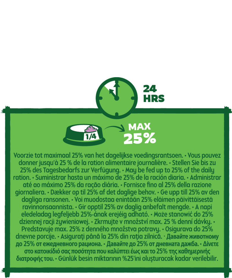 Mivel ez a keverék rostban gazdag, kiválóan alkalmas arra, hogy az állat etetőtálján kívül, jutalomfalatként is használjuk. Rejtse el a lakhely különböző pontjain, hogy ösztönözze kedvencét a mozgásra és a felfedezésre!