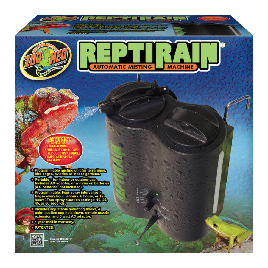 A Repti Rain modell erős, megbízható pumpával és programozható időzítővel rendelkezik, amely lehetővé teszi a permetezés időpontjának, hosszának és gyakoriságának beállítását. A készülékhez tartozó forgatható fúvókák finom vízpermetet hoznak létre, ami természetes mikroklímát teremt a terráriumban.